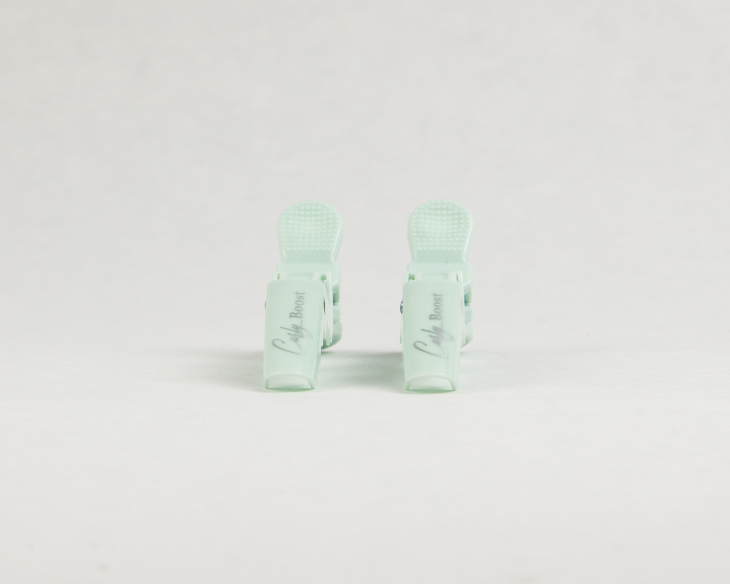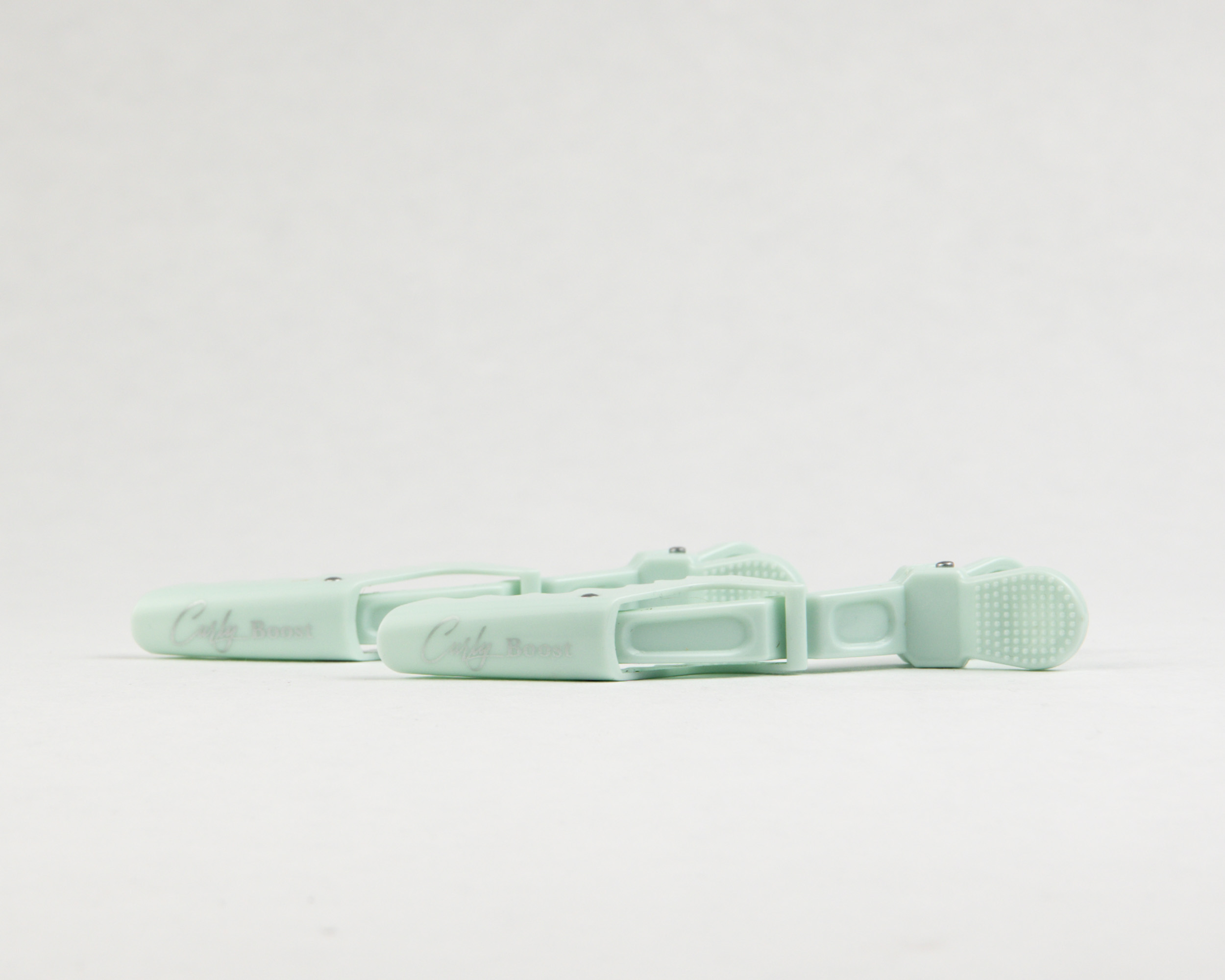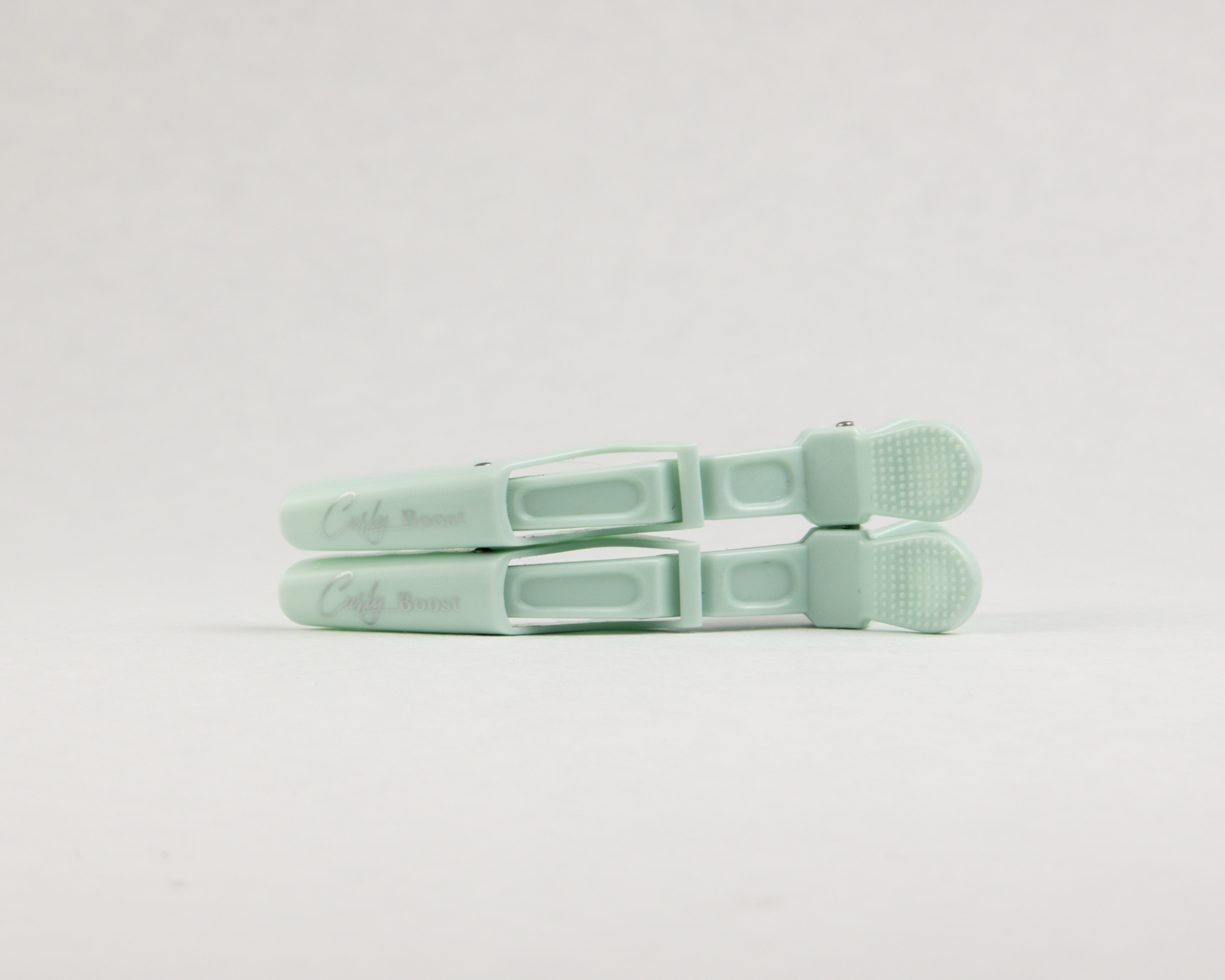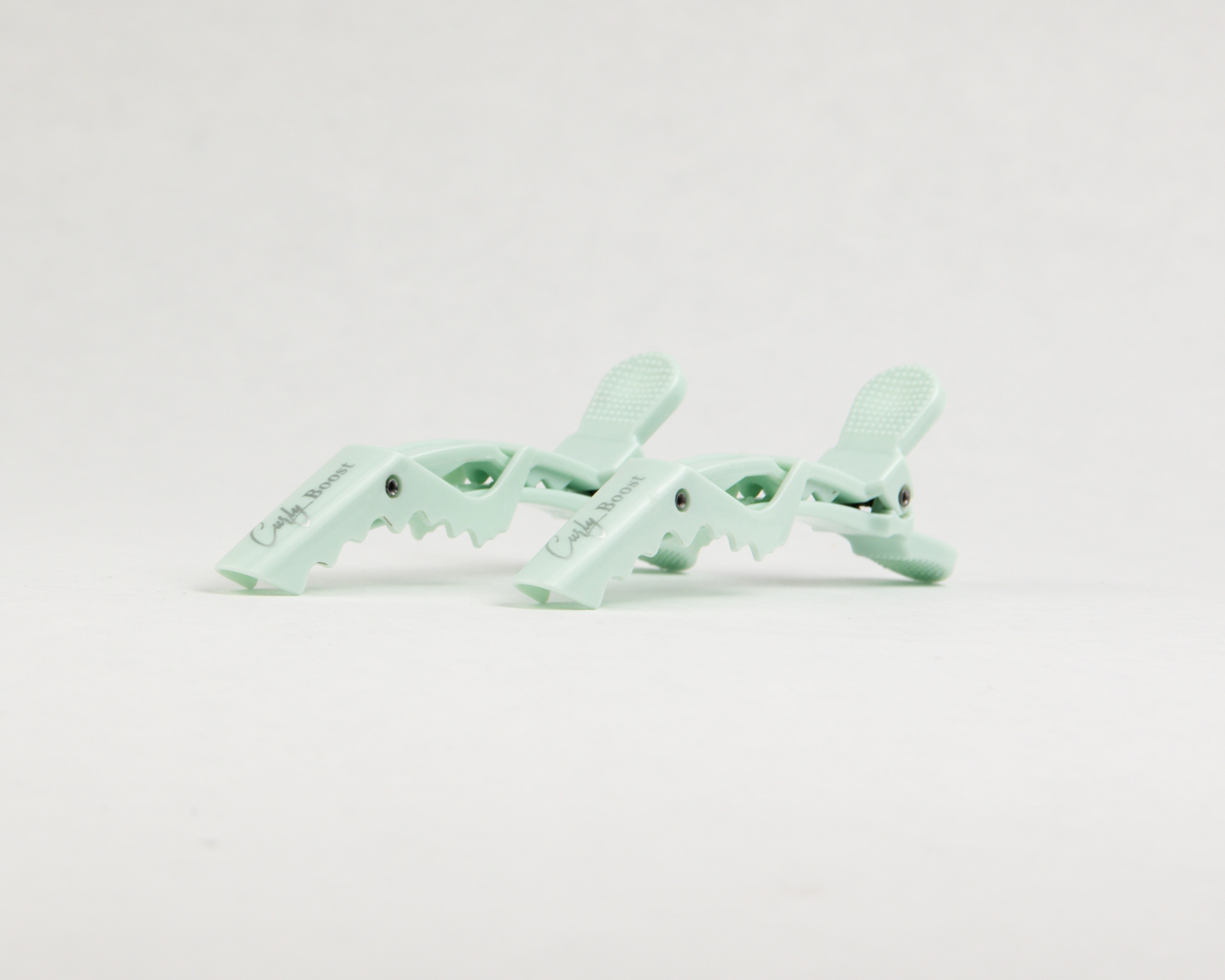 Zeegroene alligator klemmen voor krullend haar (6 stuks). Met logo, sterke grip zonder knikken. Perfect voor de curly girl routine.